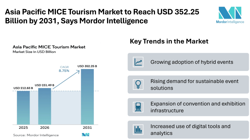 According to Mordor Intelligence, the Asia Pacific MICE Tourism Market size is expected to grow from USD 212.83 billion in 2025 to USD 231.49 billion in 2026, and further reach USD 352.25 billion by 2031, registering a CAGR of 8.75%. This steady market growth reflects improving corporate confidence, increasing international collaboration, and the return of large-scale meetings and exhibitions. The industry is benefiting from a balanced mix of domestic and cross-border events, as companies continue to rebuild engagement strategies after pandemic disruptions. Countries across the region are investing in modern venues, expanding airline connectivity, and simplifying event logistics to attract global organizers. At the same time, planners are focusing on cost efficiency and flexibility, which is encouraging the adoption of hybrid formats that combine physical and virtual participation.