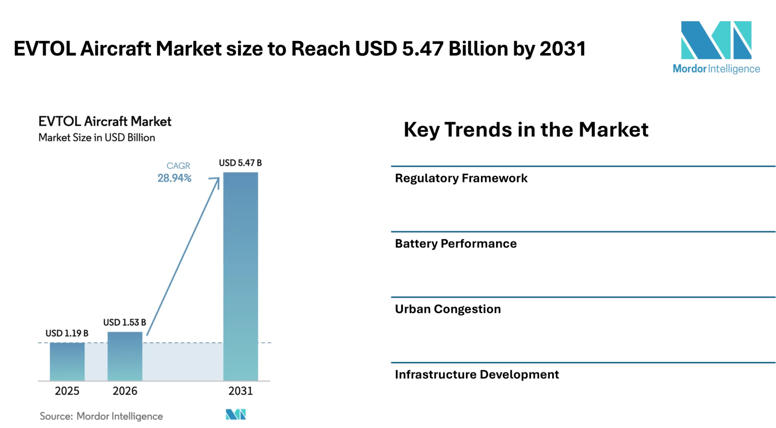 According to Mordor Intelligence, the eVTOL aircraft market size is expected to grow from USD 1.19 billion in 2025 to USD 1.53 billion in 2026 and is projected to reach USD 5.47 billion by 2031, registering a CAGR of 28.94% during the forecast period.