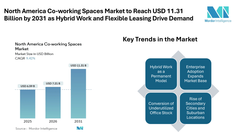 According to Mordor Intelligence, the North America co-working spaces market size was valued at USD 6.59 billion in 2025 and is estimated at USD 7.21 billion in 2026, projected to reach USD 11.31 billion by 2031, growing at a CAGR of 9.42%. This market growth reflects structural changes in how organizations use office space, especially as hybrid work becomes a long-term model rather than a temporary solution. Companies are prioritizing flexibility, cost control, and access to distributed talent, which is strengthening the North America co-working spaces industry across major cities as well as suburban locations.