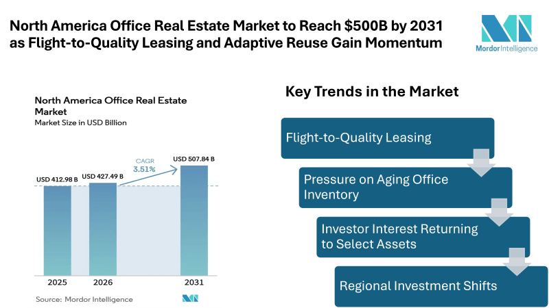 According to Mordor Intelligence, the North America office real estate market size is estimated at USD 427.49 billion in 2026, increasing from USD 412.98 billion in 2025, and projected to reach USD 507.84 billion by 2031, expanding at a CAGR of 3.51% during the forecast period. This outlook reflects both recovery and structural change within the industry, where companies are reassessing workspace strategies while property owners modernize portfolios.