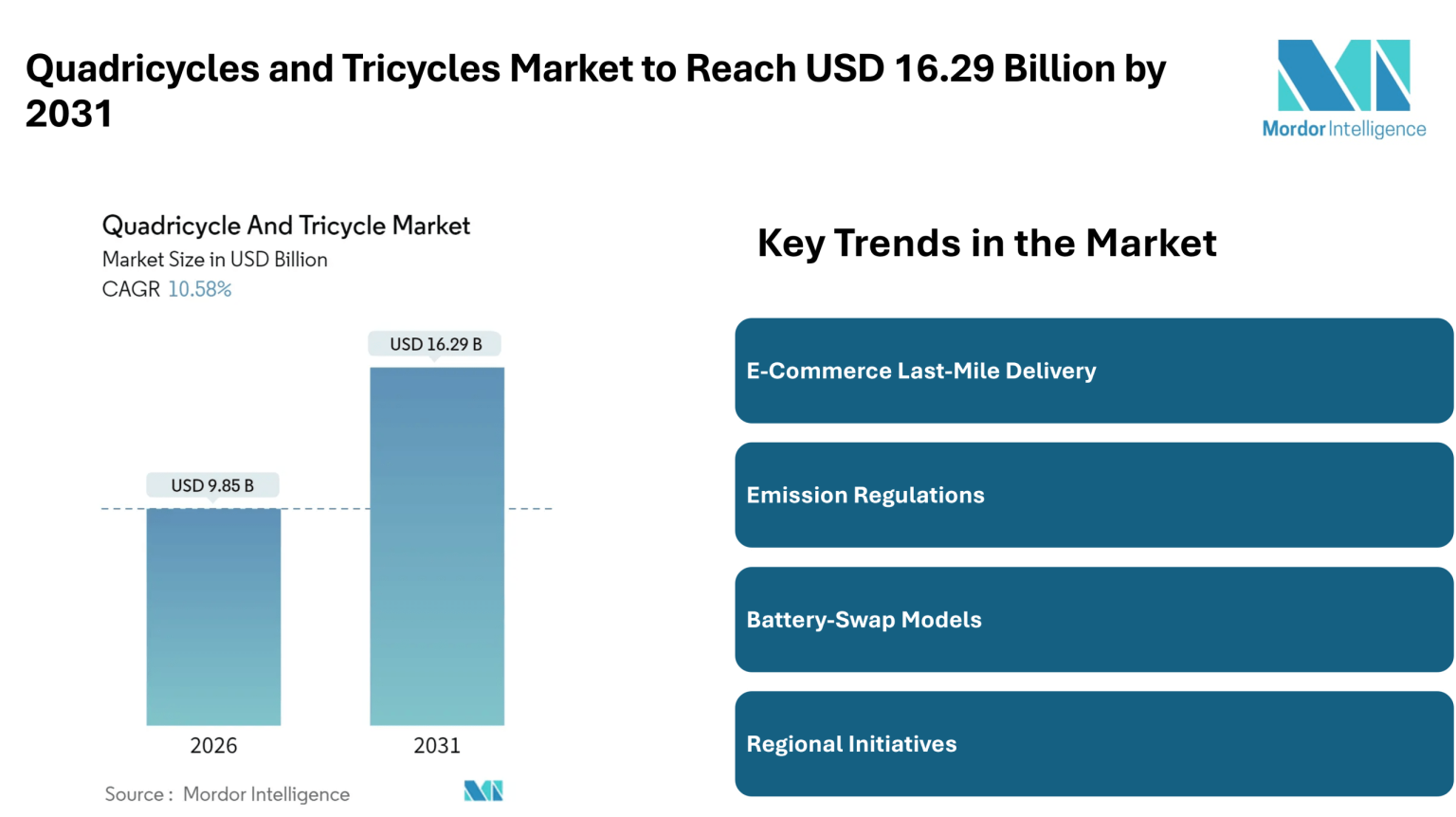 Quadricycles and Tricycles Market to Reach USD 16.29 Billion by 2031, Driven by Rising E-Commerce and Electric Mobility Trends – Mordor Intelligence